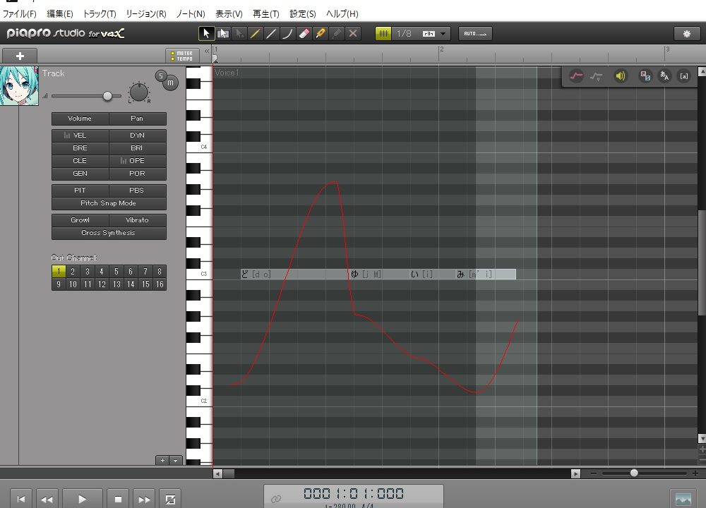 今回のustを変換した結果がこちらです。今回はPiapro Studioで開きました。無事ピッチ曲線が反映されていますね!これでConvMakiの操作は完了です!後はVOCALOID上でピッチ曲線の修正やパラメータの入力など、調声の続きを行っていきましょう。